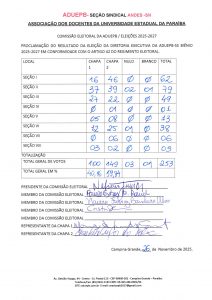 A apuração dos votos teve início após o encerramento da coleta de votos, às 17h, em todas as sessões eleitorais. Excepcionalmente, as urnas do Campus I foram transportadas para a sede da ADUEPB, onde a apuração foi centralizada e conduzida pela Comissão Eleitoral.
